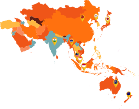 澳大利亚、印度、印度尼西亚、日本、马来西亚、新西兰、巴基斯坦、菲律宾、韩国、泰国、越南